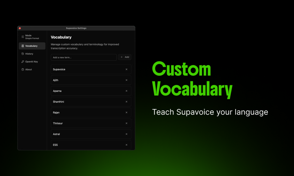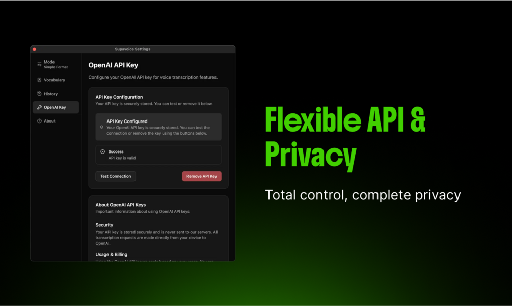 Do I need an OpenAI API key? Yes, Supavoice requires your own OpenAI API key. This gives you complete privacy (your data never passes through our servers) and direct control over usage costs.